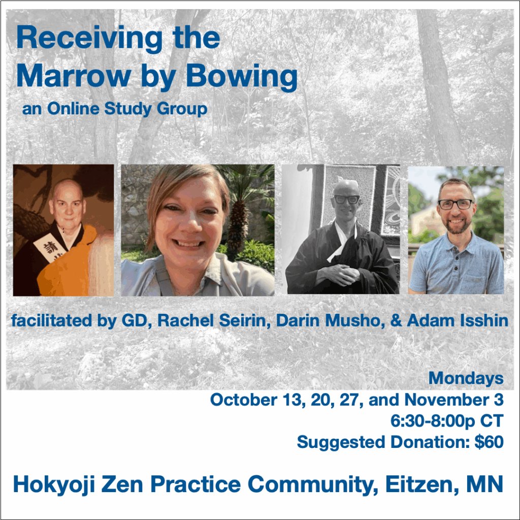 Associate teacher Onryu Kennedy, Adam Isshin Kokotovich, Darin Musho Podulke-Smith, Rachel Seiren Vilsack will be facilitators for this four week study group. We will meet online via Zoom for four Mondays: October 13, 20, 27, and November 3 @ 6:30 – 8:00pm, Central Time.